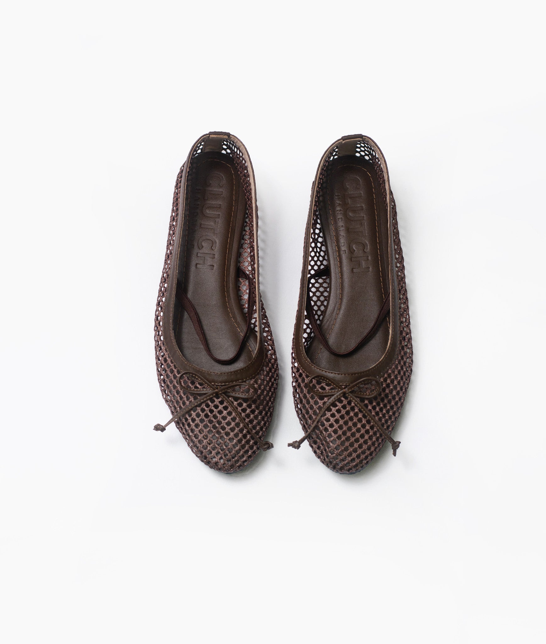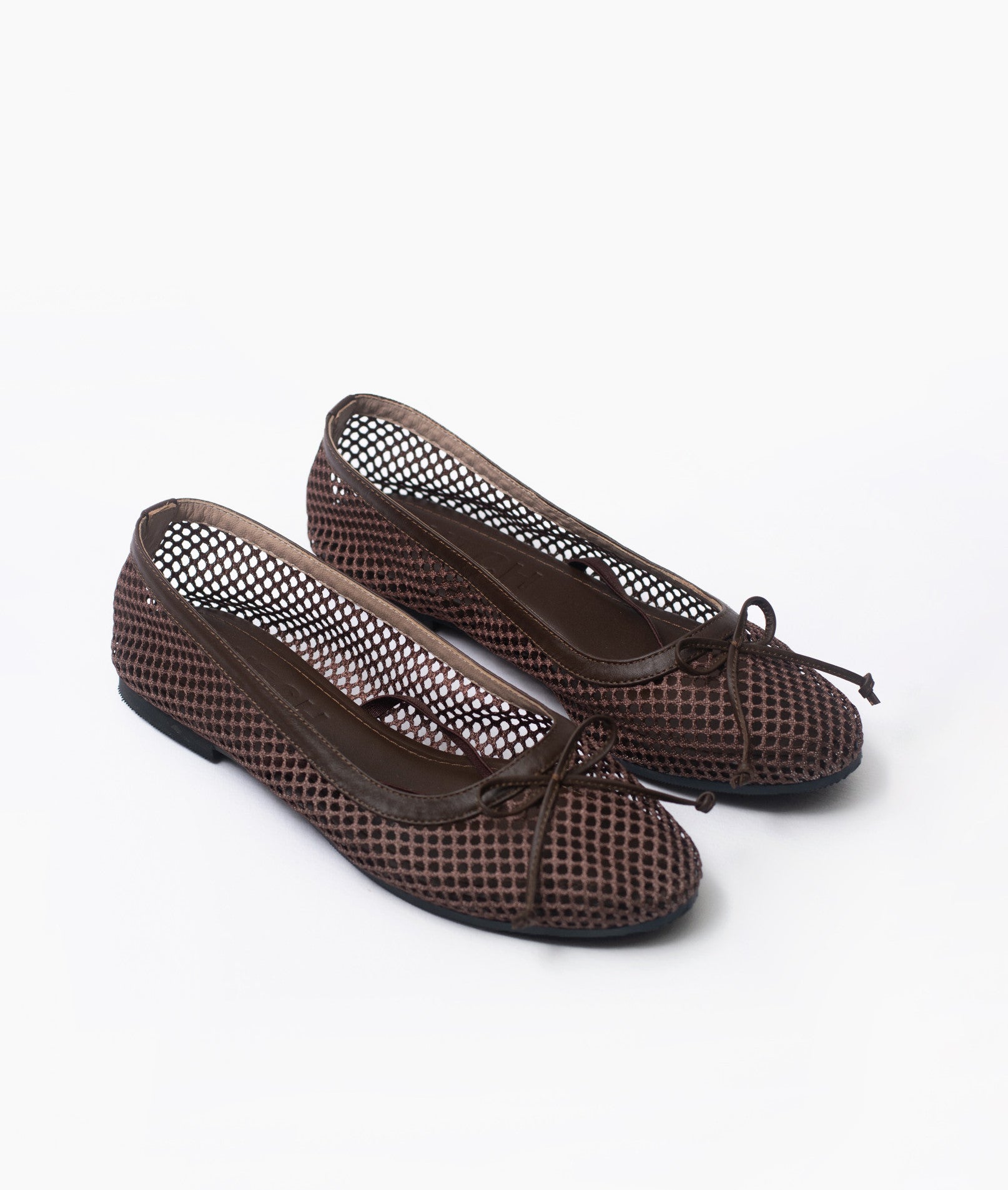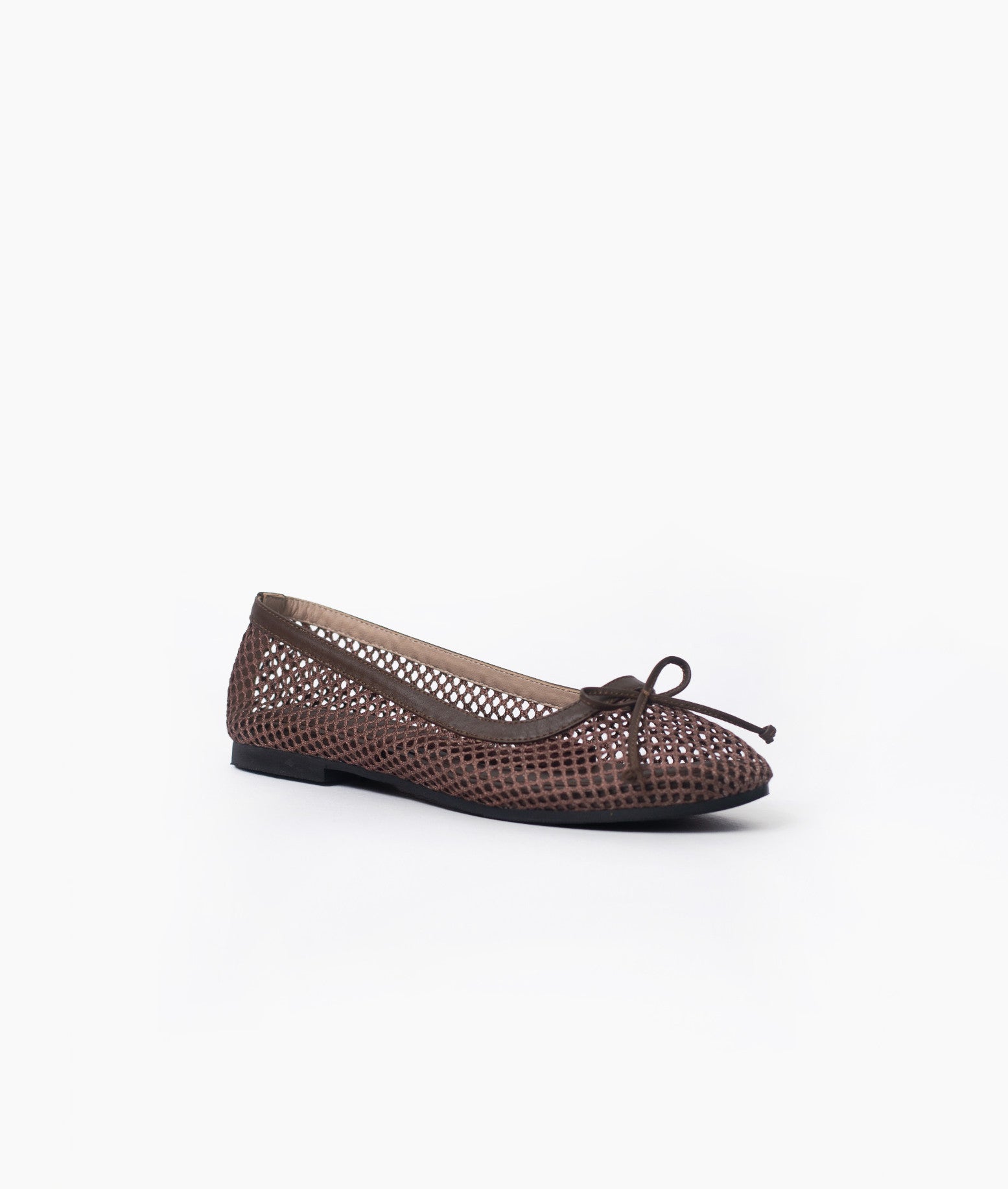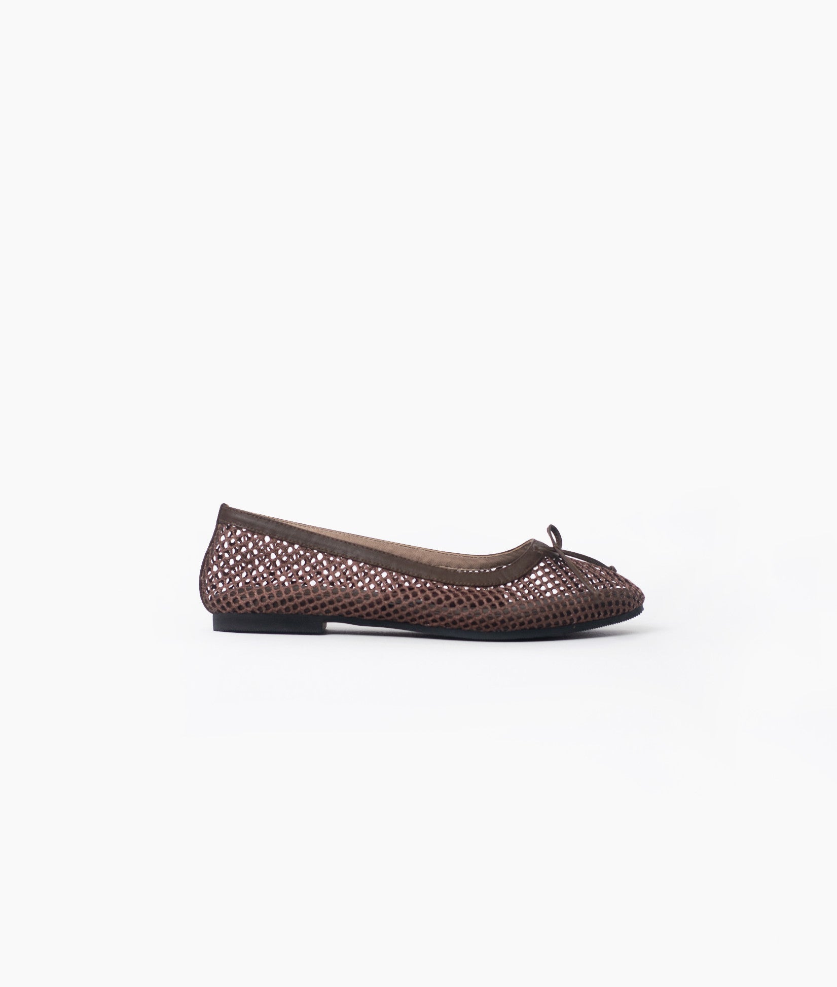 Nos unimos a la tendencia en flats que verás durante toda esta temporada. Nuestros flats Cayetana de punta redonda hechos de una malla calada y cuero.