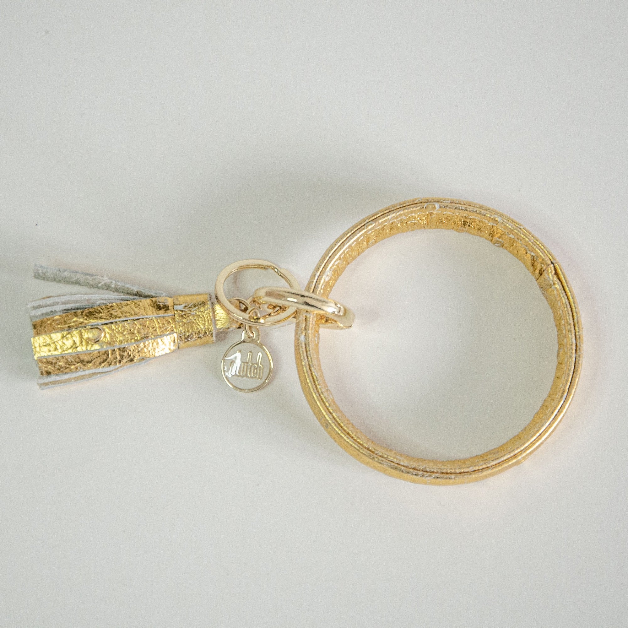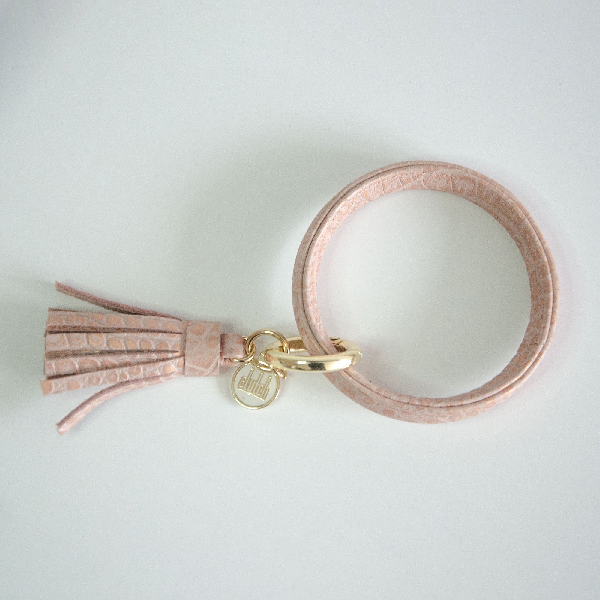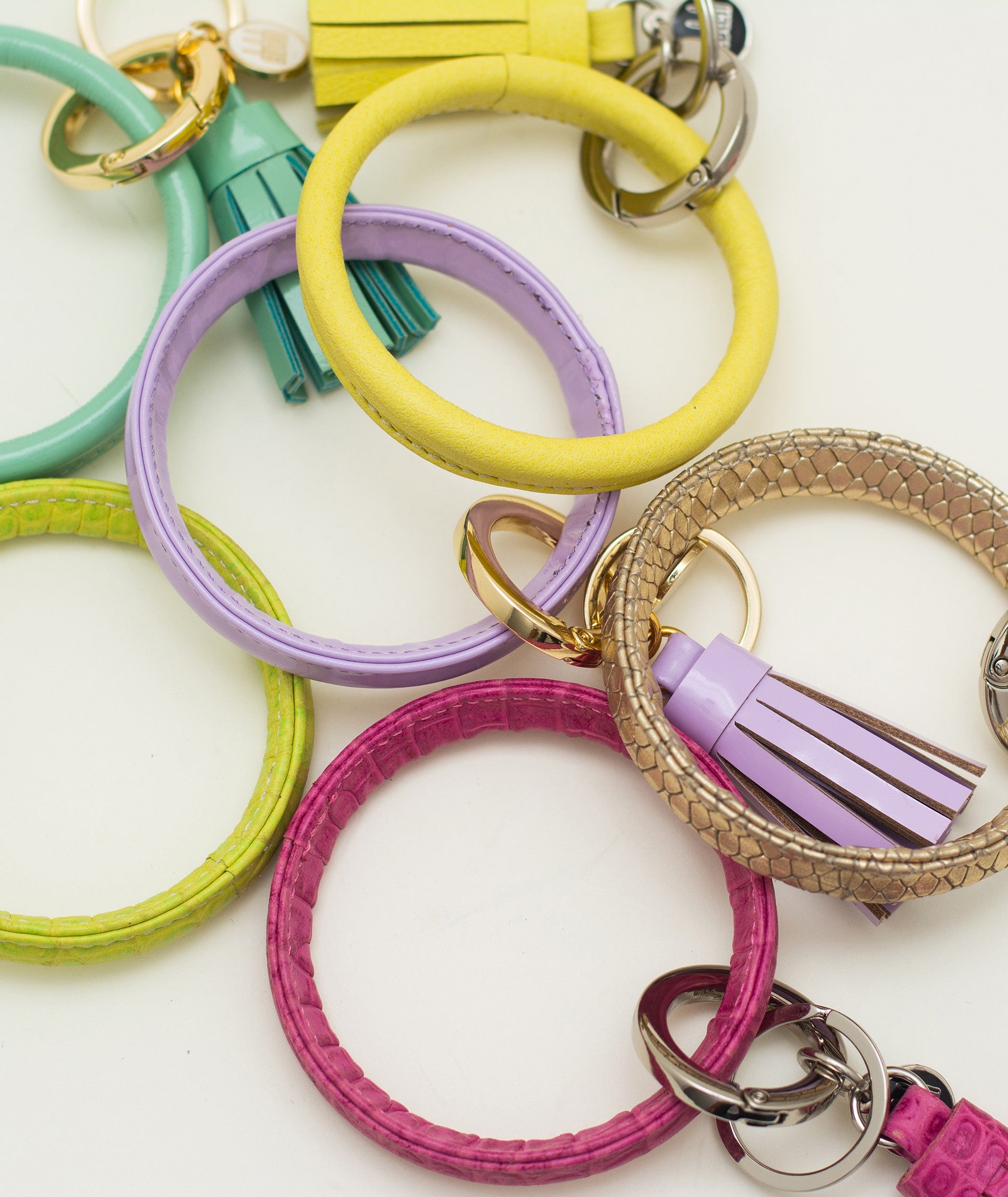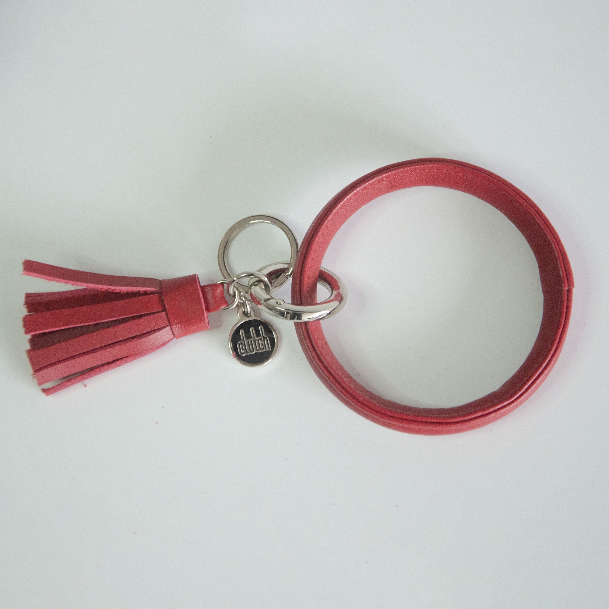 Pulseras forradas en cuero con argolla para llaves y mosquetón para enganchar lo que quieras.